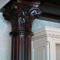 Close-up of the solid cherry carved capitals atop the solid cherry columns, and a better view of the crown molding with egg & dart details, also by Wood-Mode.