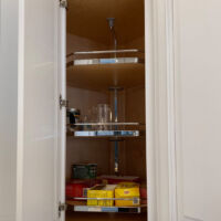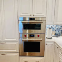 This kitchen in Clear Lake Shores, TX blends traditional styling with all the latest in modern conveniences. All of the glass-door cabinets have LED lighting cleverly integrated into the cabinet sides and shelves. Two Sub-Zero refrigerator/freezers are completely concealed within the cabinetry (can you spot them?). The Wolf combination convection steam oven and the Wolf convection oven are flush-mounted within the cabinetry. There is a pot-filler faucet above the Wolf range-top, and there’s a drawer microwave in the island. The white cabinets which are stuffed with specialty storage accessories were custom built so there’s no wasted space (see the detail photos). Also notice the stainless steel farmhouse sink, which has a Culligan reverse-osmosis water filtration system below.