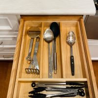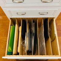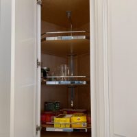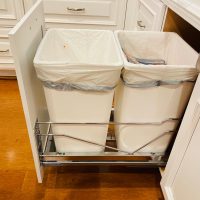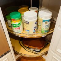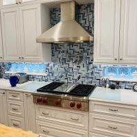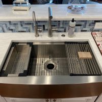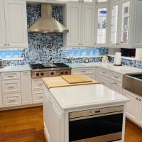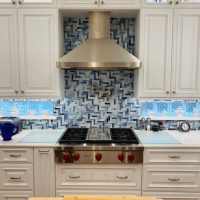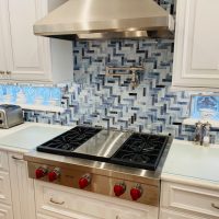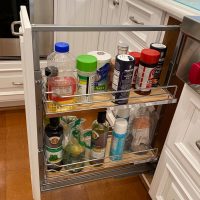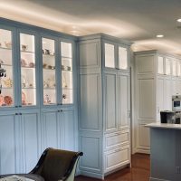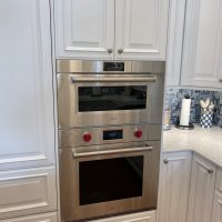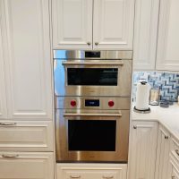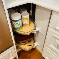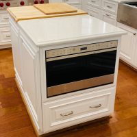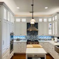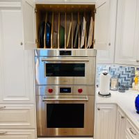 This kitchen in Clear Lake Shores, TX blends traditional styling with all the latest in modern conveniences. All of the glass-door cabinets have LED lighting cleverly integrated into the cabinet sides and shelves. Two Sub-Zero refrigerator/freezers are completely concealed within the cabinetry (can you spot them?). The Wolf combination convection steam oven and the Wolf convection oven are flush-mounted within the cabinetry. There is a pot-filler faucet above the Wolf range-top, and there’s a drawer microwave in the island. The white cabinets which are stuffed with specialty storage accessories were custom built so there’s no wasted space (see the detail photos). Also notice the stainless steel farmhouse sink, which has a Culligan reverse-osmosis water filtration system below.