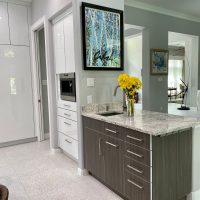This expansive contemporary kitchen features a mixture gloss white and multi-shade laminate custom cabinetry by Wood-Mode, Sub-Zero, Wolf & Cove gourmet integrated appliances, Cambria countertops and a custom Hammerton island light fixture. The design and materials blend beautifully with their exquisite art collection.